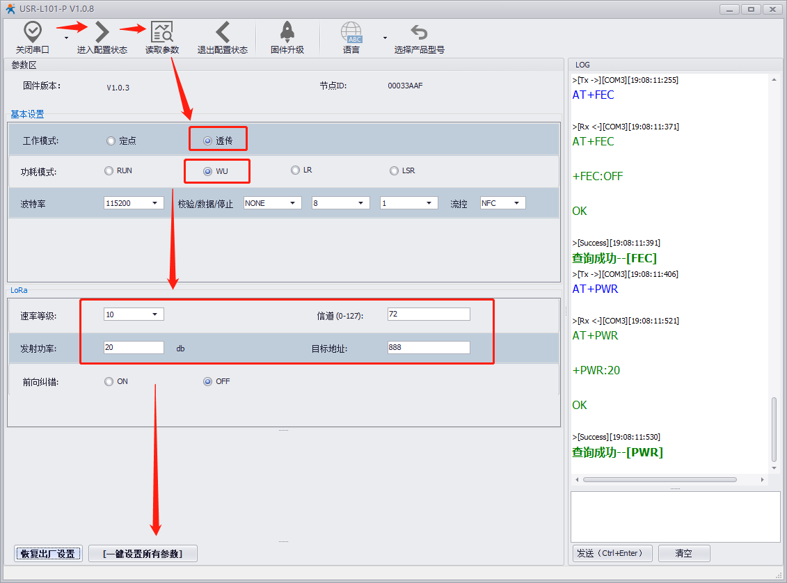打開LoRa設置軟件(L101-P),依次點擊打開串口(選擇A對應的串口號,串口參數:115200,None,8,1,NFC)、進入配置狀態、讀取參數、