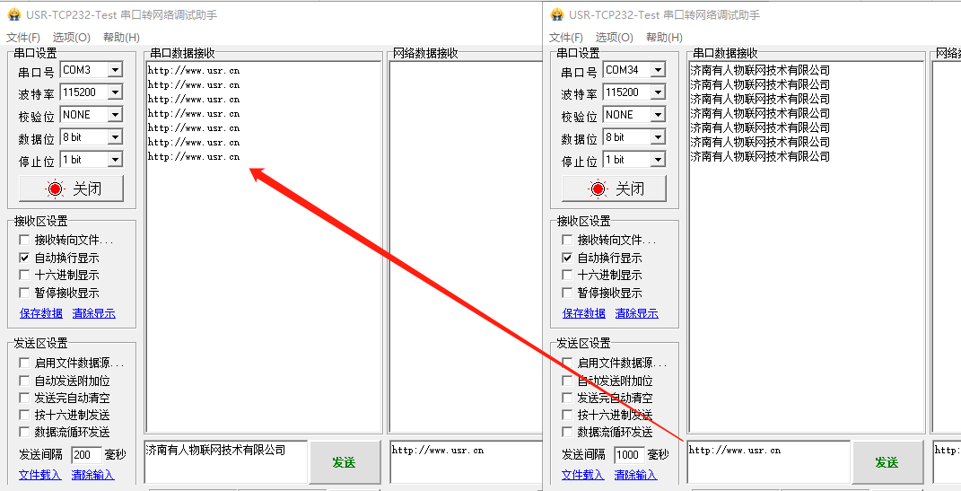 啟動兩個USR-TCP232-Test(模擬串口設備1,2)分別連接LoRa數傳終端A(com3)、B(com34)的串口,使用WU設備發送數據LR設備可接收數據,通信效果如下圖所示: