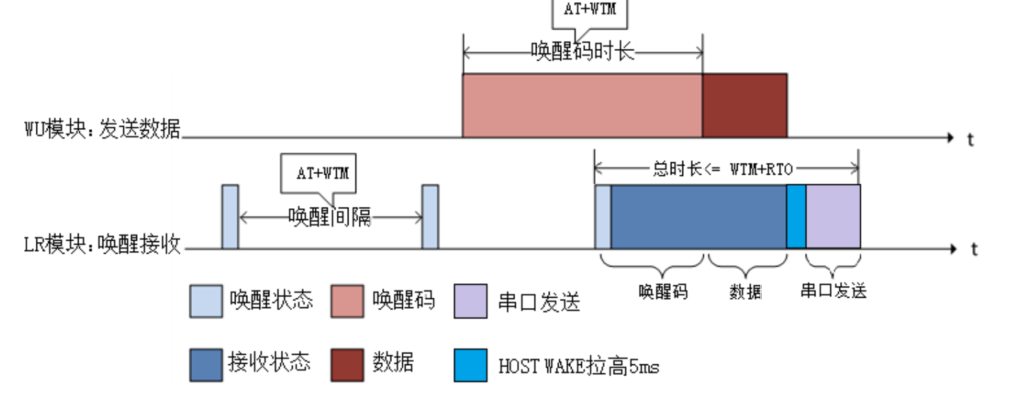 LR模式為低功耗接收模式,只能接收來工作在 WU 模式的模塊發出的數據,LR模式接收串口數據發送時需要提前拉低WAKE 引腳喚醒。