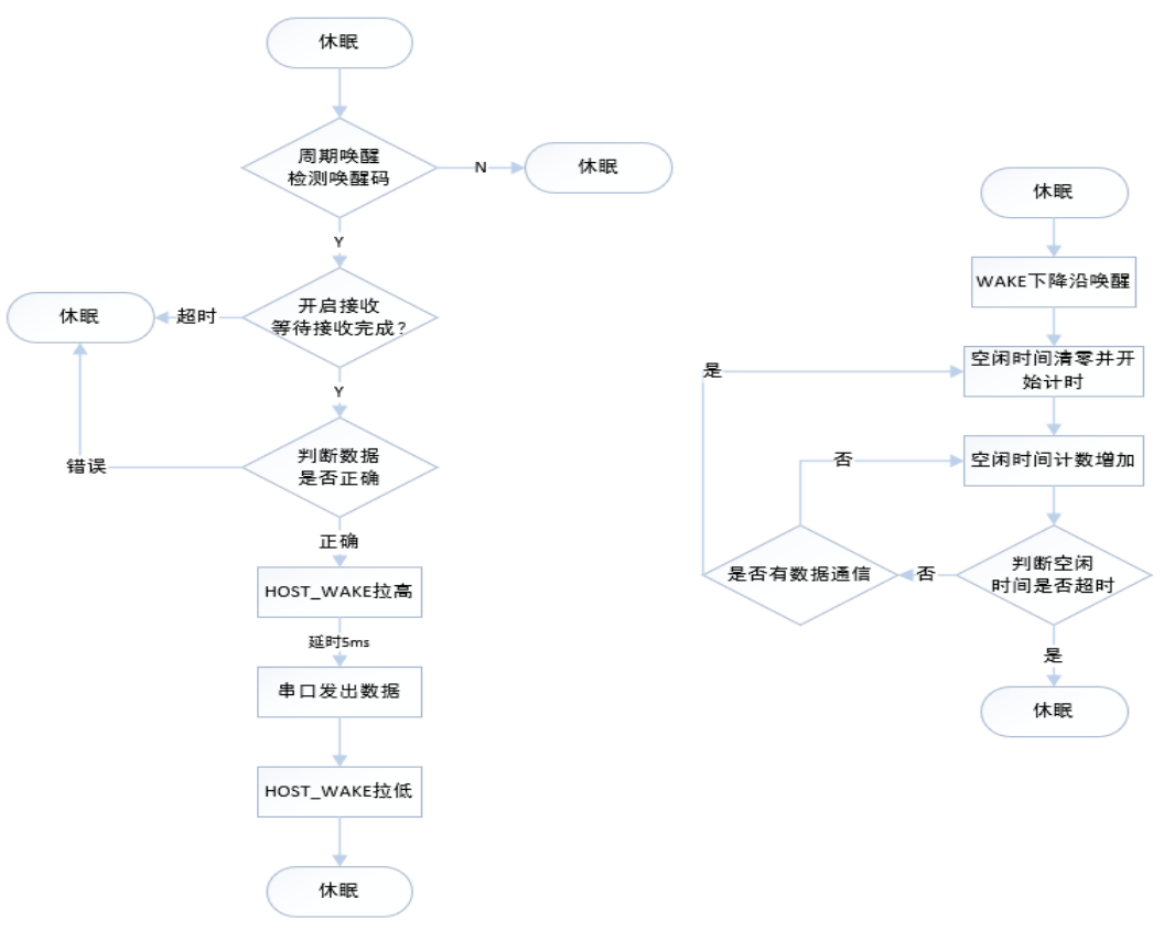 LR 低功耗接收模式,上電后如果無線和串口持續一定時間無數據通信則模塊進入休眠,休眠后模塊 定期(AT+WTM 設置喚醒間隔)喚醒來檢測喚醒碼,如果檢測到喚醒碼模塊立即進入接收狀態,等待接收 完成,接收完成后 HOST_WAKE 引腳會在串口發送數據前拉高 5ms,數據發送完成拉低(客戶可使用 HOST_WAKE 引腳喚醒自己的 MCU),若只檢測到喚醒碼未接收到數據,則等待超時后進入休眠狀態。 休眠后也可以通過 WAKE 引腳下降沿中斷來喚醒模塊,喚醒后的模塊恢復運行模式,當空閑時間大于 設定時間時模塊再次進入休眠狀態。