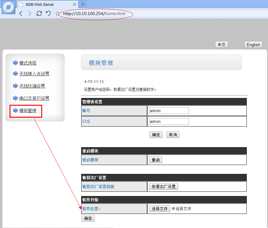 2:瀏覽器進(jìn)入模塊默認(rèn)網(wǎng)頁 10.10.100.254 用戶名密碼 都是 admin