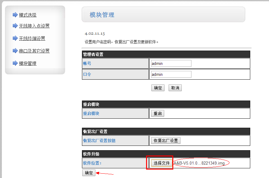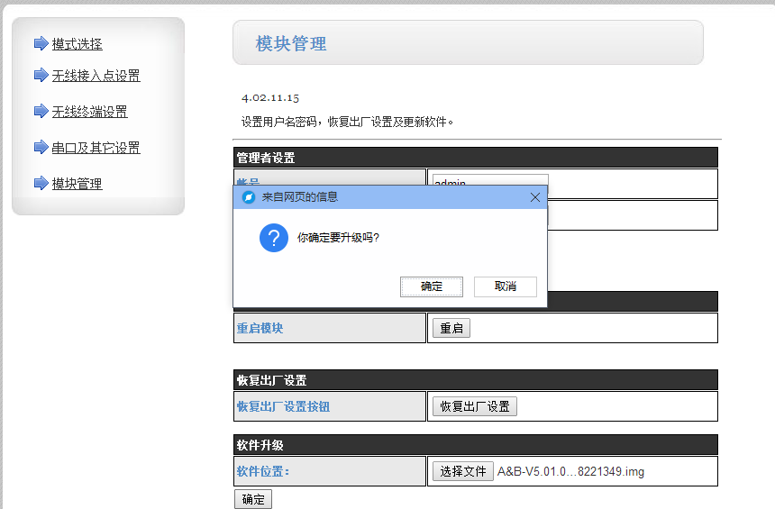 5:刷新頁面后顯示升級后的頁面,然后點(diǎn)擊“模塊管理” 的 "恢復(fù)出廠設(shè)置"