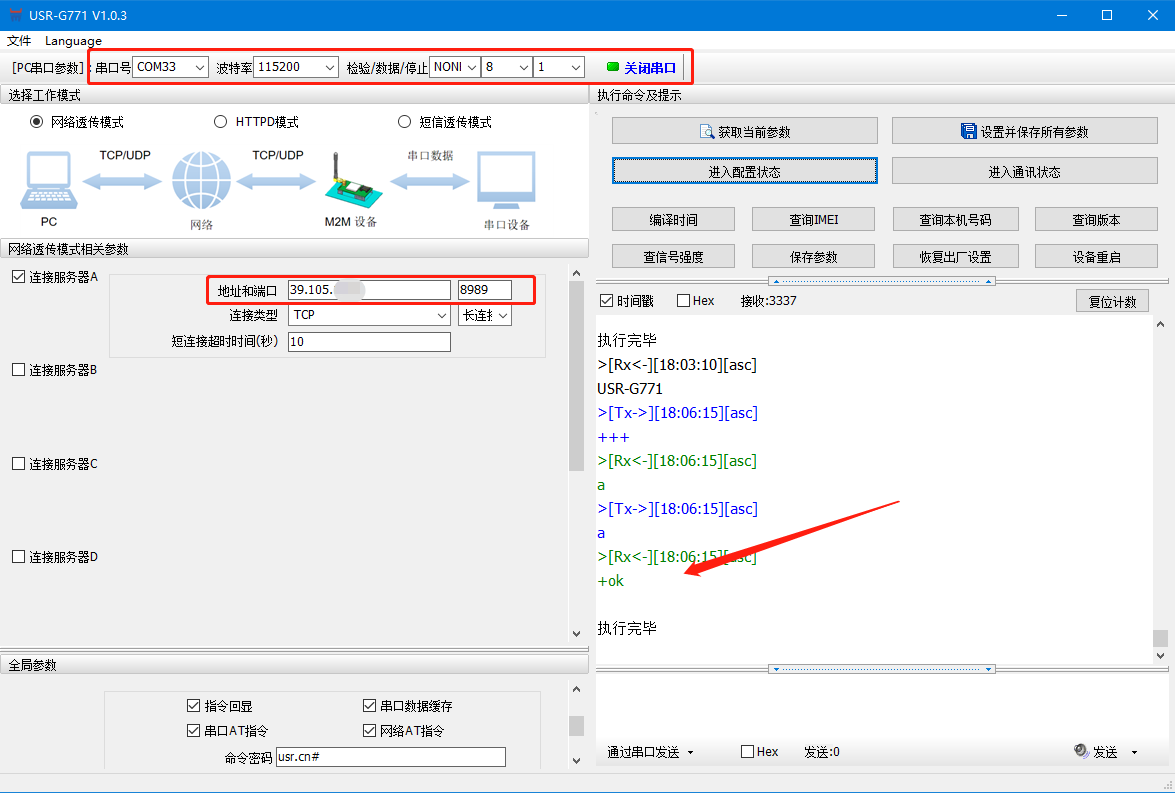 注:點擊進入配置狀態,如果模塊能返回+ok的字符,說明電腦和模塊連接是沒有問題的