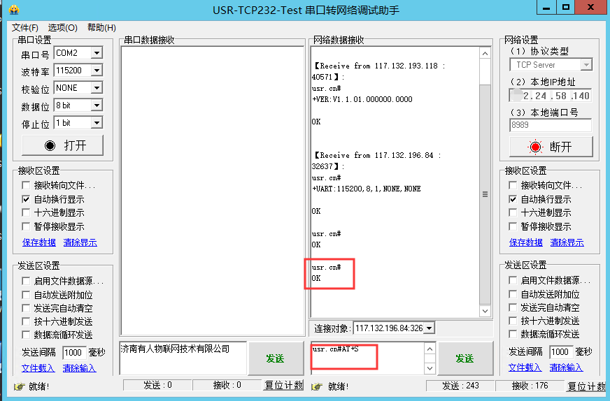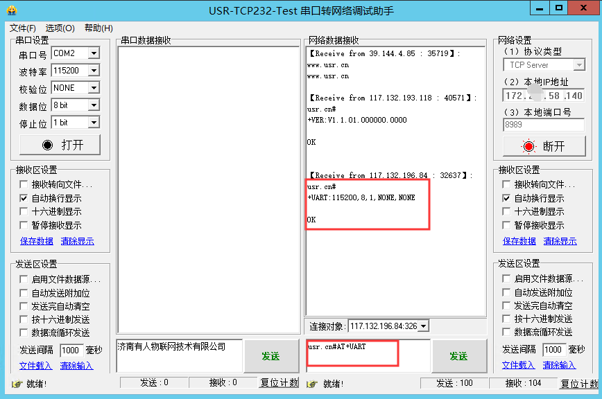 (4)查詢版本:在串口發送usr.cn#AT+VER+回車換行 可以看到模塊返回固件版本號