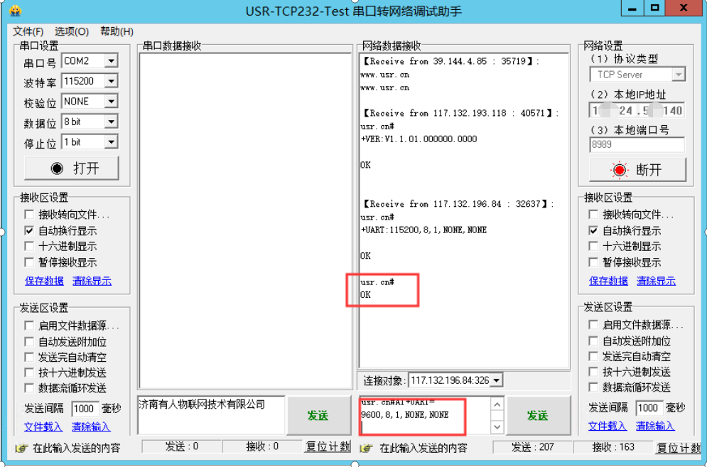(7)更改以后發送usr.cn#AT+S+回車換行 重啟以后參數保存成功;然后重新建立連接以后查詢串口參數,可以看到串口波特率已經變為9600