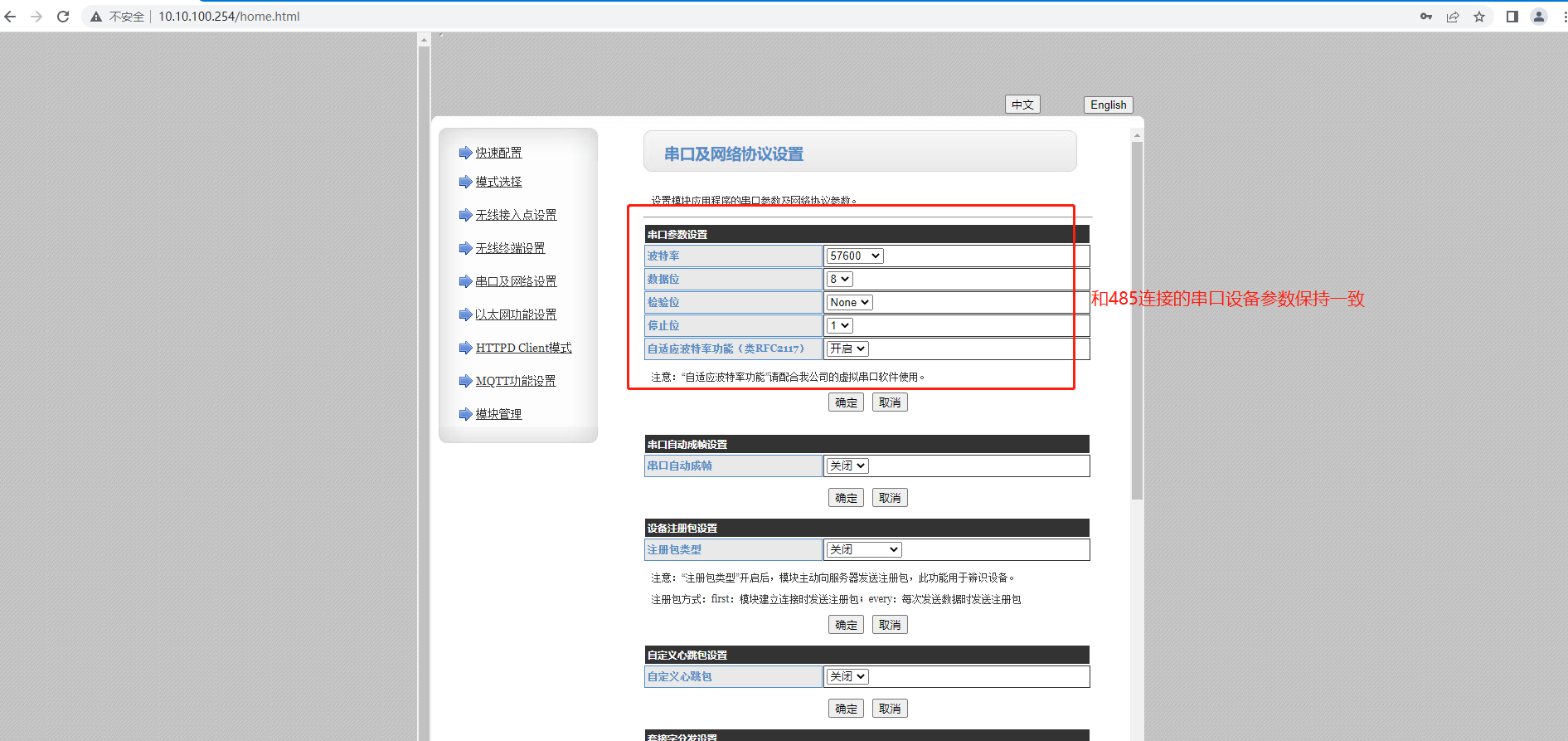 1、登錄之后,在【串口及網絡設置】,設置串口參數和終端設備保持一致(本案例使用USB轉485接電腦,使用串口調試助手模擬終端設備,所以以默認參數為準。)