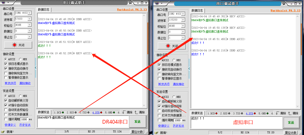 打開兩個串口調試助手,一個是虛擬串口,一個是DR404的串口,可以實現數據互傳。