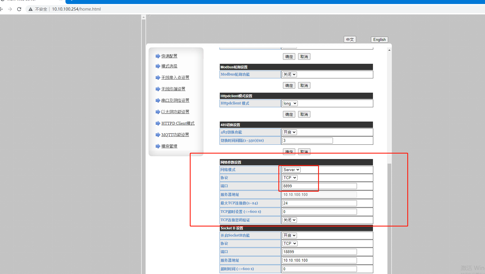 2、【網絡參數設置】設備默認工作方式為Tcp Server,在此模式下只生效端口號。