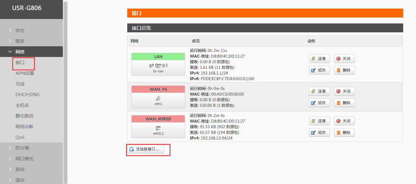 進入內(nèi)置網(wǎng)頁,點擊網(wǎng)絡--接口界面可以看到路由器現(xiàn)有的接口,這是三個接口不能隨意刪除,若不小心刪除可以將設備恢復出廠設置。