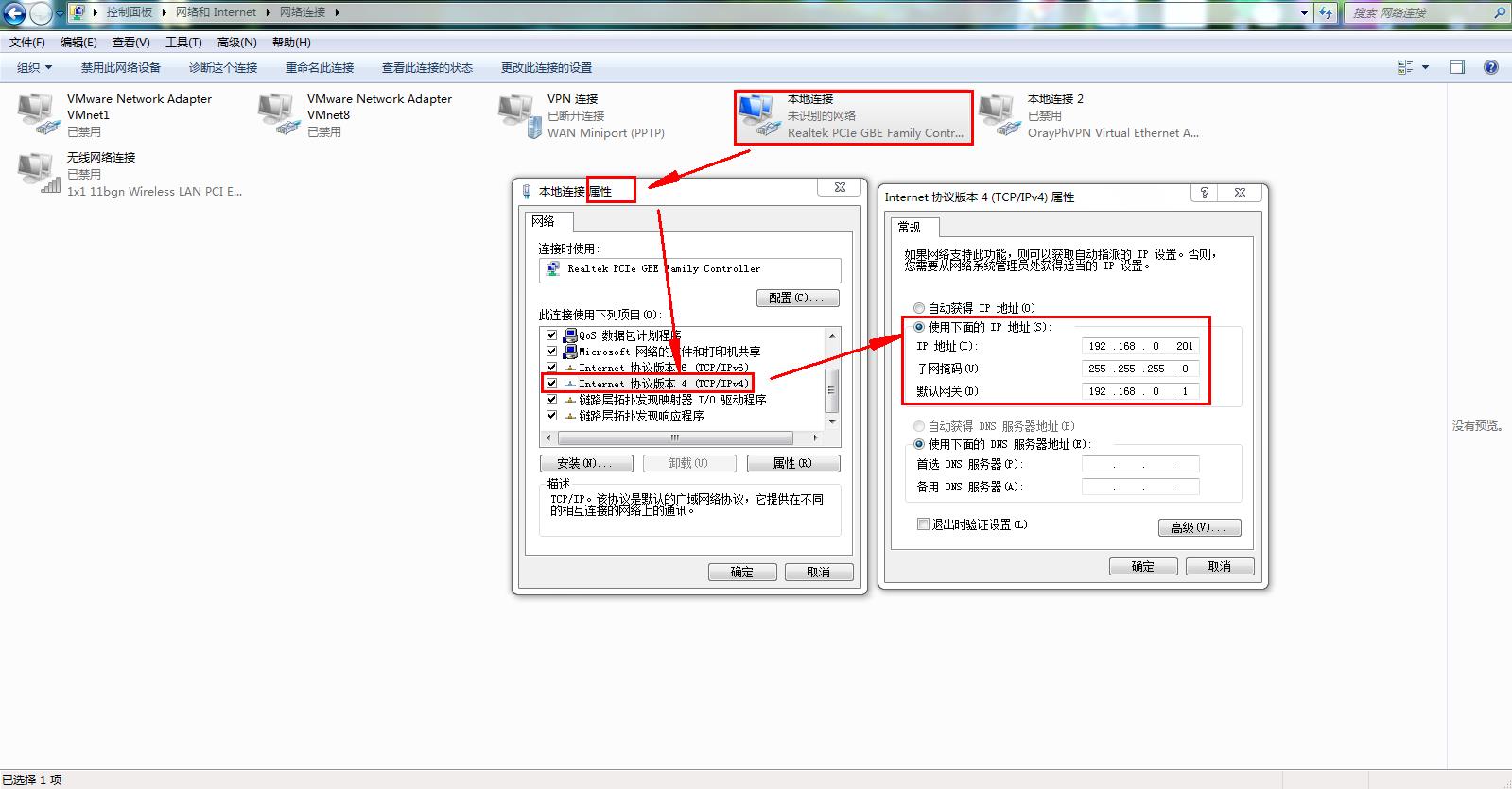 電腦打開(kāi)控制面板,只保留本地連接網(wǎng)卡,禁用其他網(wǎng)卡。本地連接右擊屬性,找到IPv4,將IPv4的參數(shù)設(shè)置靜態(tài)IP,192.168.0.201,子網(wǎng)掩碼255.255.255.0,網(wǎng)關(guān)192.168.0.1
