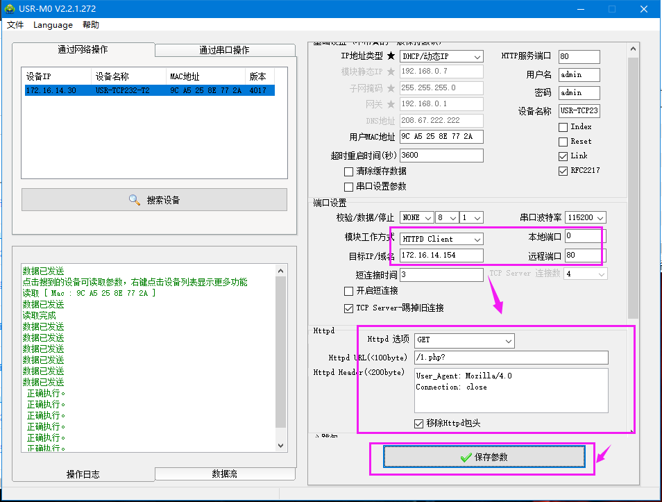 1.設置軟件設置,選擇httpd client 模式,局域網HTTP服務器地址:172.16.14.154 HTTP服務器端口號為80,HTTP報頭路徑為/1.php?,設置完成點擊保存設置。