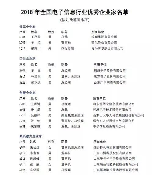 經過評審,山東省信息產業協會、山東電子學會推薦共29位企業家榮獲“2018年全國電子信息行業優秀企業家”榮譽稱號,名單如下:
