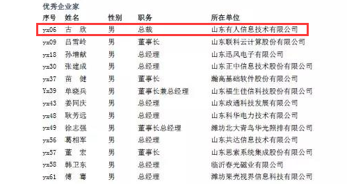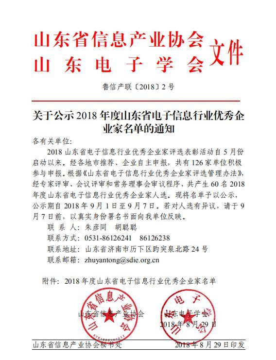2018年9月,根據《山東省電子信息行業優秀企業評審管理辦法》,本著“公正、公平、公開”的原則,山東省信息產業協會、山東電子學會在山東省126家申報單位中,經過初審、復核、專家評審,遴選了60位“全省電子信息行業優秀企業家”,并擇優推薦參加中國電子企業協會組織的“國家級電子信息行業優秀企業家”評選活動。
