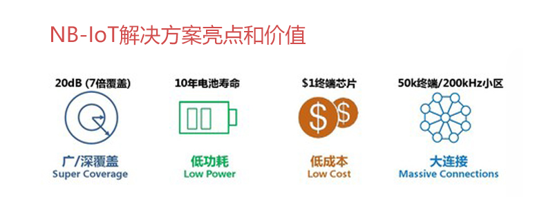 從功耗和性能上看,基站覆蓋范圍廣,終端以低于 2G 的功率即可接入網絡;維持網絡接入的開銷減少;終端工作在低功耗模式下,如采用節能模式可使得99%的時間里功耗只需15微瓦;芯片采用低功耗。對于戶外應用的位置跟蹤(老人、動物、非機動車)的應用,電池可以使用2-5年。對于資產定位,如農林、環境、能耗數據采集與監測,電池可以使用5-10年。和 2G 相比,NB-IoT 能實現多達 20dB 以上的增益,使得 NB-IoT 網絡能夠覆蓋更廣、更深,并有能力覆蓋到地下停車場、地下管網。