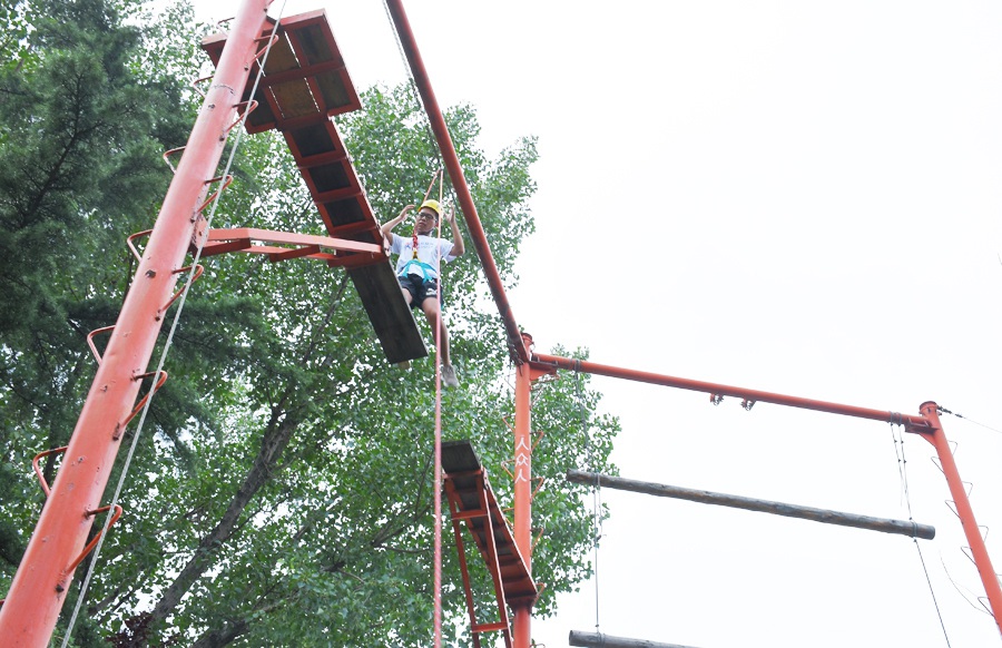 規則:在距離地面8米的高空之上,利用鋼結構與木板搭起一座“中間斷開、間距達1.2-1.4米”的獨木橋,需要一鼓作氣快速通過。