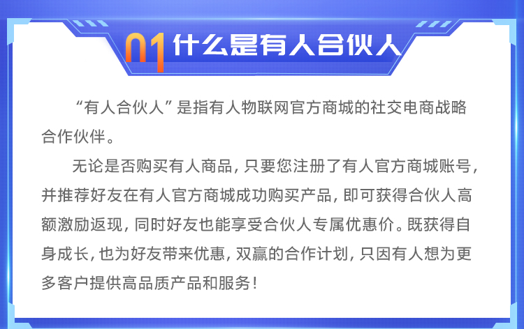為答謝老客戶一直以來對有人品牌的支持與信賴,有人物聯網特此推出“合伙人”(點擊藍字快速參加)活動,希望通過本活動,為廣大老客戶及身邊朋友帶來“雙重福利”。