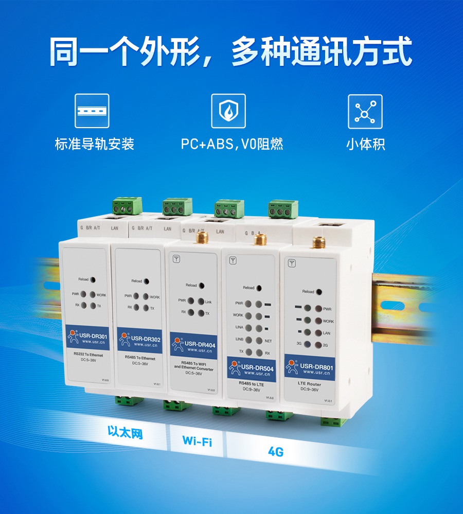 產品包含串口服務器、4G DTU、4G工業路由器等不同種類;同一個外形,多種通訊方式,支持以太網、Wi-Fi、4G聯網;自帶35mm導軌卡扣。“麻雀雖小,五臟俱全”,適合所有導軌式場景應用。