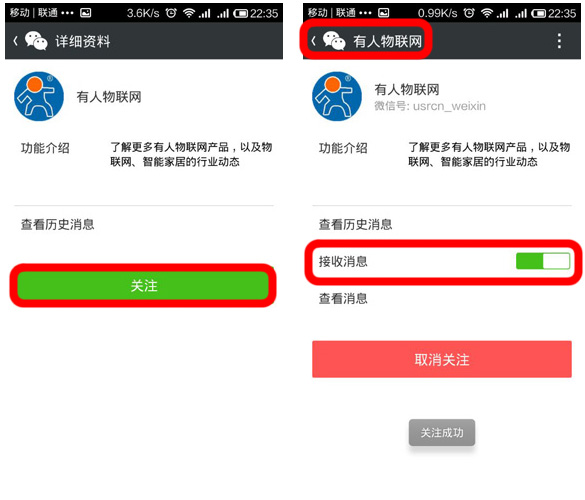 點擊“關注”,關注成功之后,確定“接收消息”為開啟,然后點擊“查看歷史消息”或左上角返回。