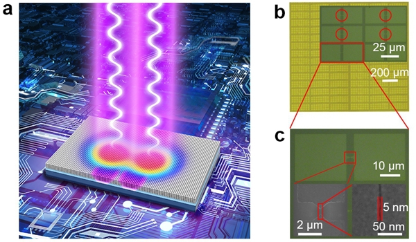 亞10 nm的結構在集成電路、光子芯片、微納傳感、光電芯片、納米器件等技術領域有著巨大的應用需求(圖1),這對微納加工的效率和精度提出了許多新的挑戰。激光直寫作為一種高性價比的光刻技術,可利用連續或脈沖激光在非真空的條件下實現無掩模快速刻寫,大大降低了器件制造成本,是一種有競爭力的加工技術。然而,長期以來激光直寫技術由于衍射極限以及鄰近效應的限制,很難做到納米尺度的超高精度加工。近期,中國科學院蘇州納米技術與納米仿生研究所張子旸研究員與國家納米中心劉前研究員合作,在Nano Letters上發表了題為“5 nm Nanogap Electrodes and Arrays by a Super-resolution Laser Lithography”的研究論文,報道了一種他們開發的新型5 nm超高精度激光光刻加工方法(DOI: 10.1021/acs.nanolett.0c00978)。