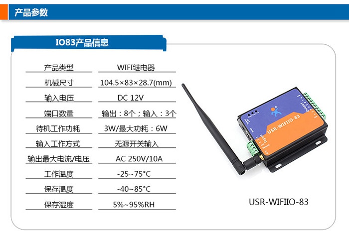 USR-WIFI-IO-83控制終端是有人物聯網研發的用于智能家居、物聯網等領域的終端設備,只要使用掌控寶的windows/IOS/Android等平臺的控制軟件,用戶便可輕松實現“局域網和遠程的監測控制”。 USR-WIFI-IO-83同時支持WIFI和網線連接,支持三路開關量監測(輸入),八路繼電器控制(輸出)。 |