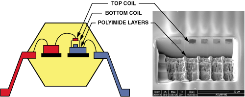 ED和光電耦合器中使用的光電二極管相比,耦合器隔離器是基于芯片級變壓器磁耦合器(圖2)。平面變壓器使用CMOS金屬層以及在鈍化層上方放置的金層。金層下面的高擊穿聚酰亞胺層將頂部變壓器線圈與底部隔離。連接到頂部和底部線圈的高速CMOS電路提供了每個變壓器及其外部信號之間的接口。晶圓級處理提供了一種在單個封裝中集成多個隔離通道以及其他半導(dǎo)體功能的低成本方法。一世耦合器技術(shù)消除了與光耦合器相關(guān)的不確定的電流傳輸比,非線性傳遞函數(shù)以及漂移(隨時間和溫度變化);減少多達(dá)90%的功耗;無需外部驅(qū)動器或分立設(shè)備。