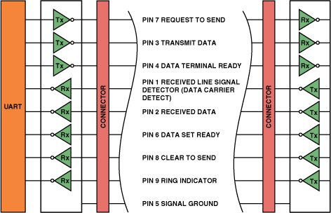 RS-232規(guī)范定義了具有20條信號線的25針D型連接器的引腳排列,但更常見的是具有8條信號線的9針連接器,如圖5所示。每個方向使用一條線進行數(shù)據(jù)傳輸;其余線路指定用于通信協(xié)議。最簡單的說,RS-232只需三條線即可實現(xiàn):Tx(發(fā)送數(shù)據(jù)),Rx(接收數(shù)據(jù))和GND(地)。25針連接器中定義了用于設(shè)備安全的保護性接地。此線通常連接到電源接地或機箱接地,不應(yīng)連接到信號接地或系統(tǒng)之間。