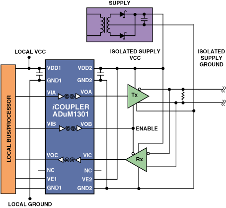 i Coupler設(shè)備的一項新穎功能是它們能夠在同一封裝中組合發(fā)送和接收通道。在我耦合變壓器本身是雙向的,所以信號可以在任一方向,只要通過如適當(dāng)?shù)碾娐反嬖谟谧儔浩鞯拿恳粋?cè)。以這種方式,為多通道隔離器提供了多種發(fā)送/接收通道配置。