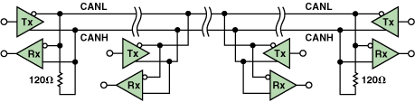如圖10所示,CAN總線使用平衡的2線差分接口,通常工作在3 V或5V。采用非歸零(NRZ)編碼,以最小的數(shù)量確保緊湊的消息。過渡和高抗噪性。CAN總線收發(fā)器使用一對漏極開路設(shè)備來創(chuàng)建CANH(V CC – 0.9 V)到CANL(1.5 V)的差分信號。當(dāng)被驅(qū)動時,發(fā)射器產(chǎn)生占優(yōu)勢的信號,該信號代表邏輯低電平。當(dāng)沒有發(fā)送器被驅(qū)動時,上拉電阻將總線設(shè)置為V CC / 2,產(chǎn)生隱性信號,該信號表示邏輯高電平。一個備用控制使收發(fā)器進入低功耗模式。低功耗接收器在待機模式下保持活動狀態(tài),監(jiān)視總線狀態(tài)變化,并在檢測到活動時發(fā)信號通知控制器激活本地節(jié)點。