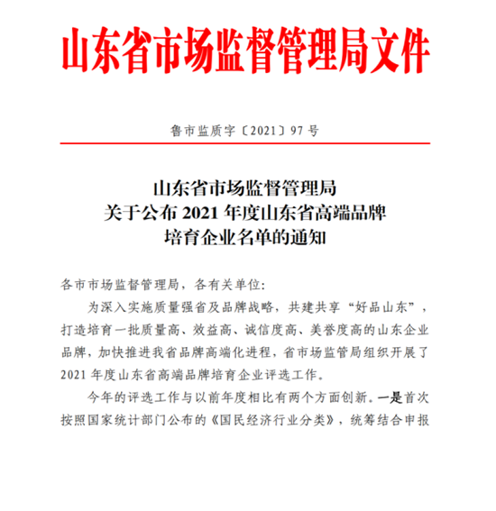 為深入實施質量強省及品牌戰略,共建共享“好品山東”,打造培育一批質量高、效益高、誠信度高、美譽度高的山東企業品牌,加快推進我省品牌高端化進程,省市場監管局組織開展了2021年度山東省高端品牌培育企業評選工作。