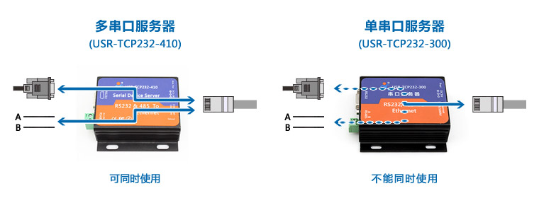 串口服務(wù)器分為單串口服務(wù)器和多串口服務(wù)器,“有人”的T24系列為單串口方案(-300典型,485和232二選一,不能同時使用),M4系列為多串口方案(-410典型,485和232可同時使用)。 |