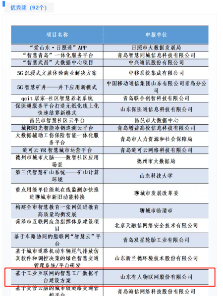 近日,由國家信息中心指導,山東省大數據局主辦的第一屆新型智慧城市大賽頒獎儀式在青島市完美收官。有人物聯網申請的基于物聯網化的智慧農業監測解決方案、綜合商務樓宇物業設備管理智能化改造解決方案和基于工業互聯網的智慧工廠數據平臺建設方案在全國20個省、48個市的2000個參賽項目,突出重圍,三次上榜第一屆中國新型智慧城市創新應用大賽?興業賽道獲獎名單,分別獲二等獎“智優獎”、三等獎“智佳獎”、優秀獎“智成獎”。這極大程度彰顯了有人物聯網在數字產業化、產業數字化方面的解決方案的高推廣價值和高商業價值,展示了有人物聯網在智慧城市建設方面的卓越能力和強大實力。