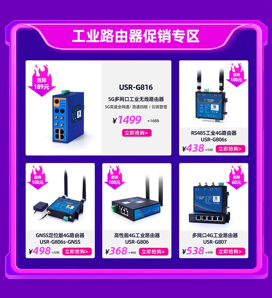 重點產品講解:新品USR-G805c重磅上市,關注直播間了解產品詳情,并參與1元秒殺活動。USR-M100、USR-G817兩款新品預告,工業路由器、DTU、串口服務器、LoRa、工控等將依次登場,我們帶你玩轉產品,秒到產品。