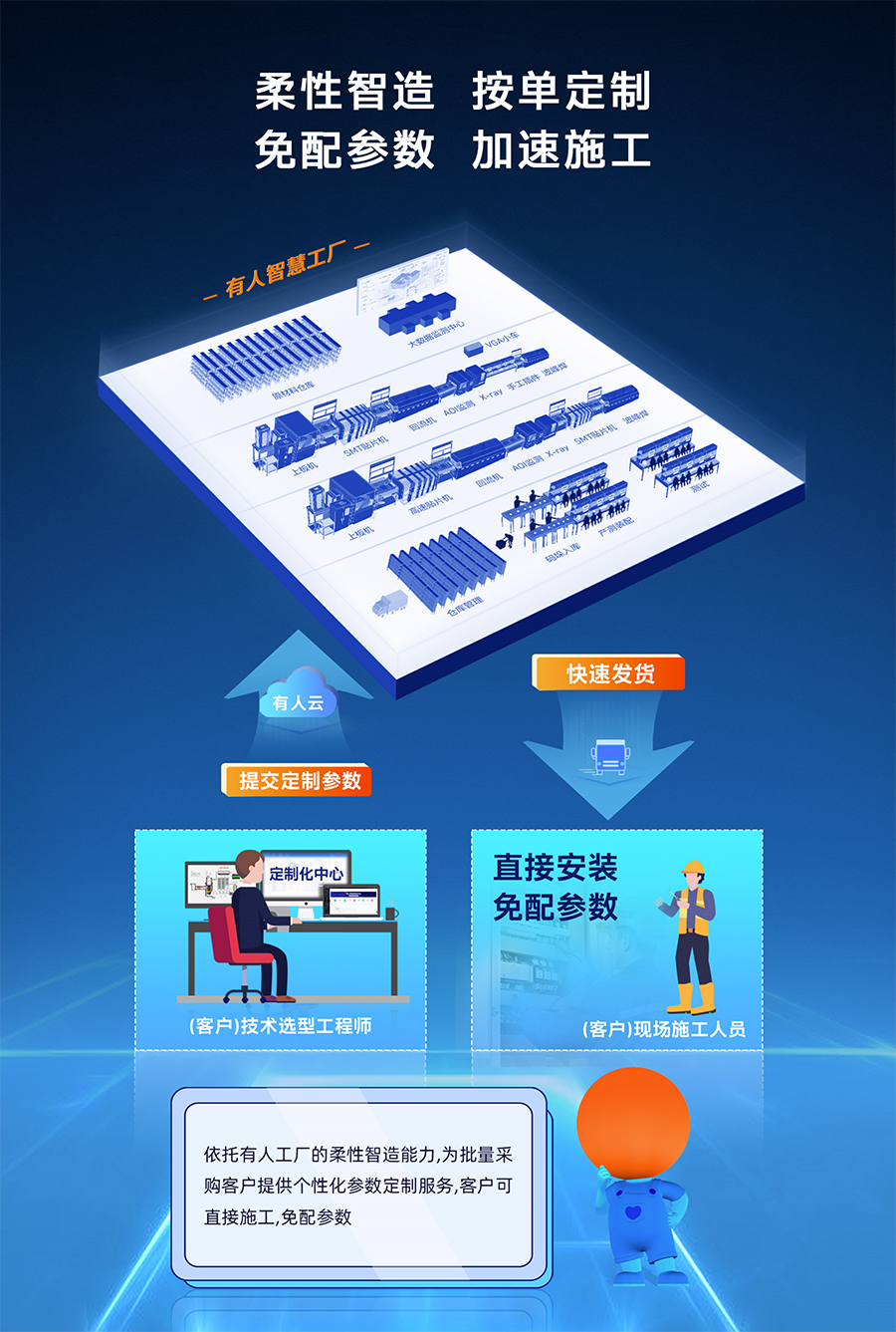 云,也是定制化中心。用戶只需在有人云上填寫參數(shù)項,發(fā)起定制申請。有人內(nèi)部串聯(lián)起后端各環(huán)節(jié),標(biāo)品出貨,免配參數(shù)直接應(yīng)用,節(jié)省人力投入,更可遠(yuǎn)程運維。