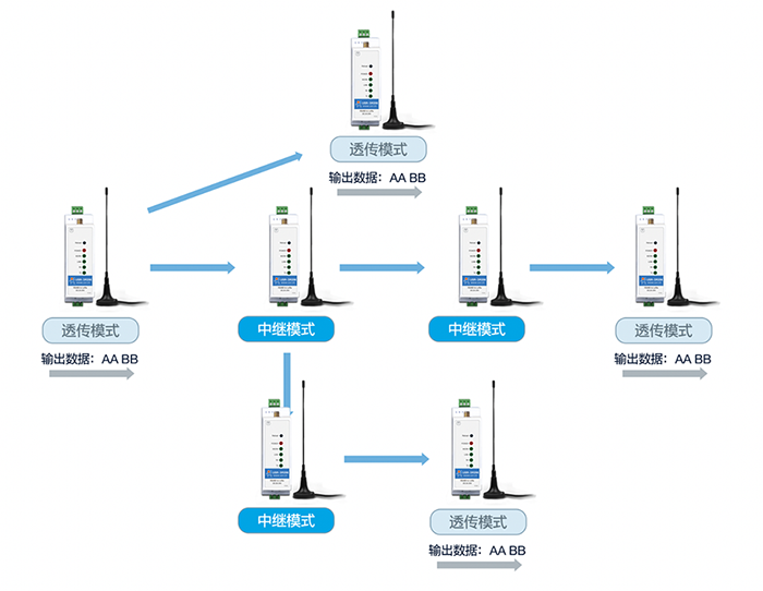 使用LoRa數(shù)據(jù)傳輸不再擔(dān)心現(xiàn)場環(huán)境障礙物多、傳數(shù)距離達不到需求的問題,中繼功能可運行多個中繼網(wǎng)絡(luò),模塊自動轉(zhuǎn)發(fā),增加無線傳輸距離,適用超遠距離或障礙物較多環(huán)境下通訊。