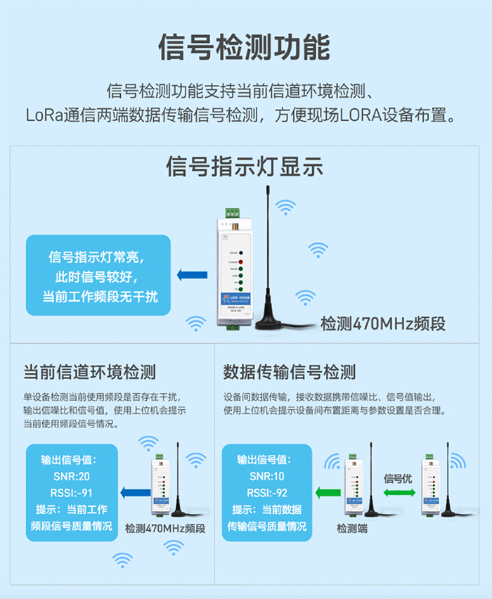 現(xiàn)場應(yīng)用布置更方便,用戶通過信號檢測功能能夠詳細了解當(dāng)前LoRa布置是否合理,環(huán)境中是否有干擾,輕松掌控現(xiàn)場情況。