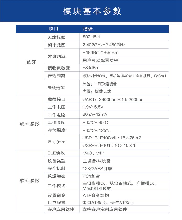 USR-BLE100是一款支持藍牙v4.1 BLE協議(兼容v4.0)的低功耗ble模塊,通過該模塊可以使傳統的串口設備或者MCU控制的設備進行無線的數據傳輸。