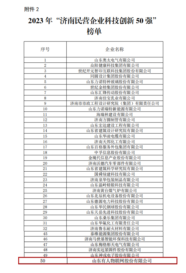 10月10日上午,濟南市委市政府召開新聞發布會,濟南市民營經濟局、濟南市工商聯重磅發布“2023年濟南民營企業100強”系列榜單,包括“2023年濟南民營企業科技創新50強”和“2023年濟南民營企業成長潛力50強”。綜合評估企業經營規模、利潤稅收、科技創新、員工就業、黨組織建設等多項因素,有人物聯榮登濟南民企百系列榜單,榮獲2023年濟南市民營企業科技創新50強企業。