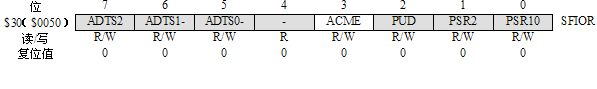 與模擬比較器相關(guān)的寄存器是SFIOR、ACSR。用戶通過這兩個(gè)寄存器的相關(guān)位實(shí)現(xiàn)對模擬比較器的設(shè)置和控制。