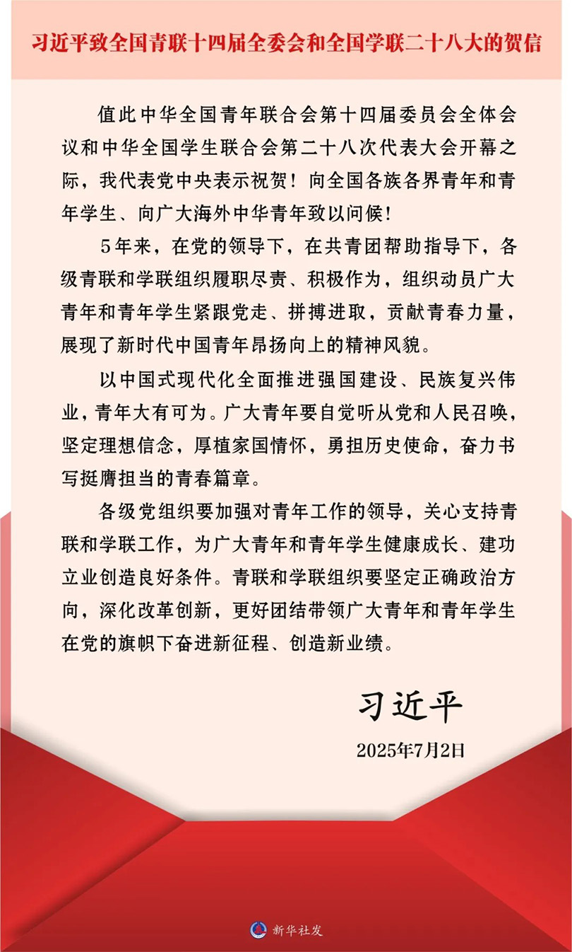 7月2日-3日,中華全國青年聯(lián)合會第十四屆委員會全體會議和中華全國學生聯(lián)合會第二十八次代表大會勝利召開。中共中央總書記、國家主席、中央軍委主席習近平致賀信,對廣大青年提出殷切期望,希望大家自覺聽從黨和人民召喚,堅定理想信念,厚植家國情懷,勇?lián)鷼v史使命,奮力書寫挺膺擔當?shù)那啻浩隆?/p>