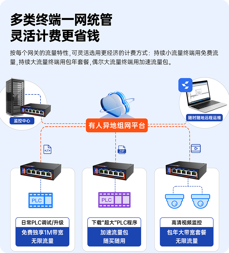 同一組網內根據每個網關下接終端的特性,可靈活選用更經濟的計費方式:持續小流量終端用免費1M帶寬,持續大流量終端推薦包年大帶寬,低頻大流量終端則適用組網流量包