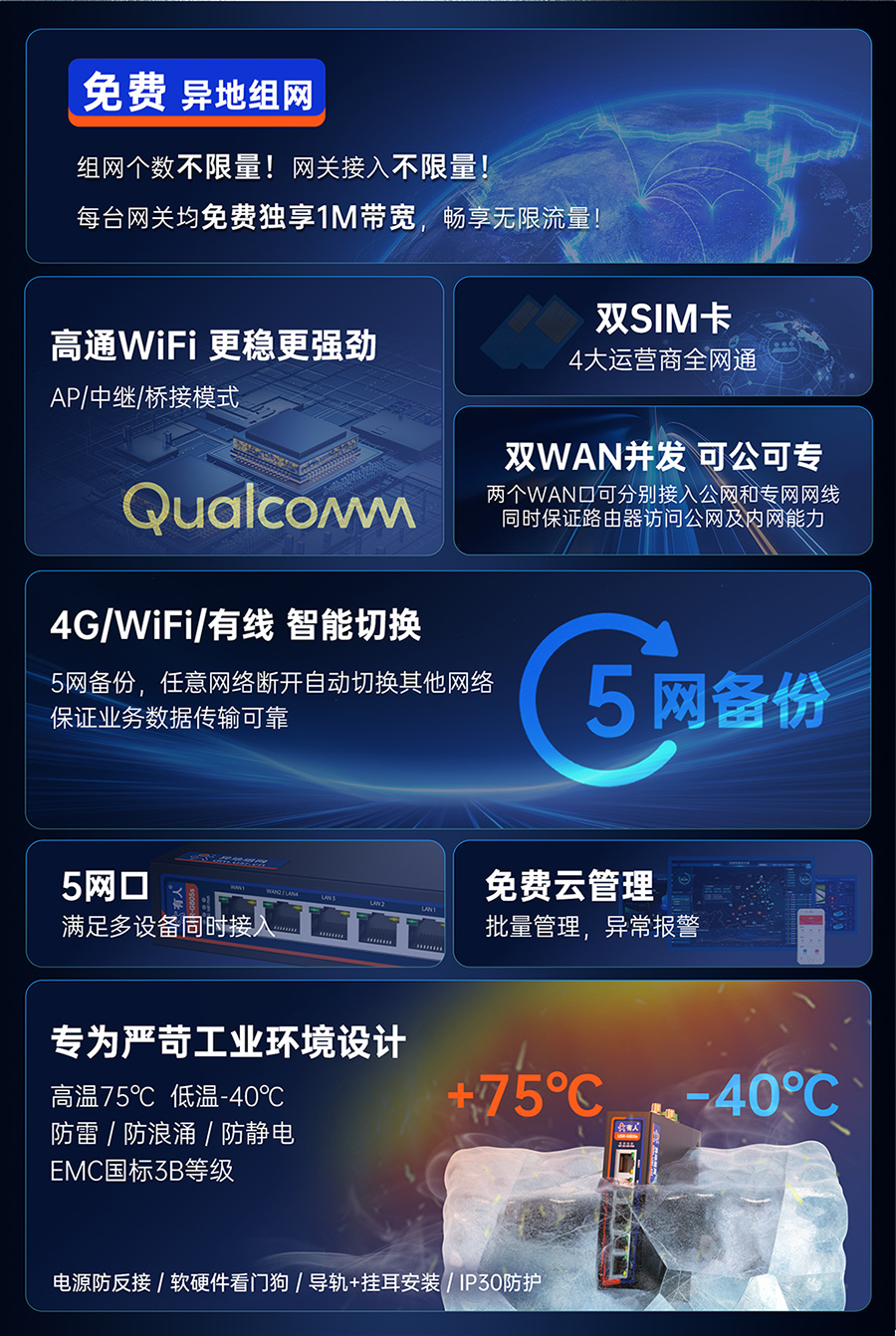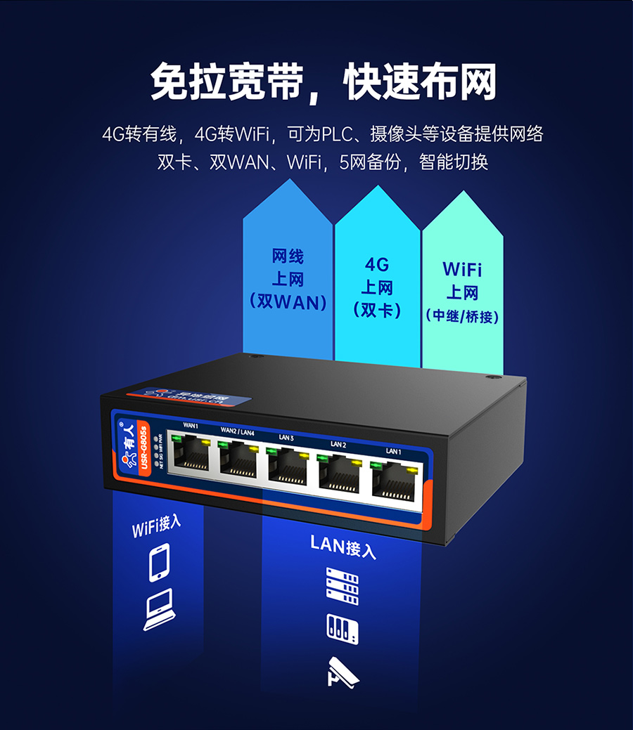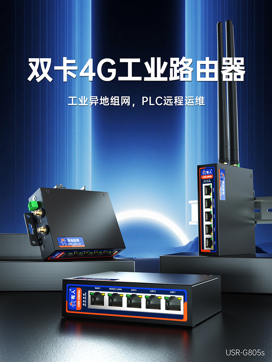 全新雙卡4G工業路由器 G805s 現已上市,同樣支持免費異地組網功能,5網口,雙SIM卡,適用于多路攝像頭+PLC綜合運維監控場景。