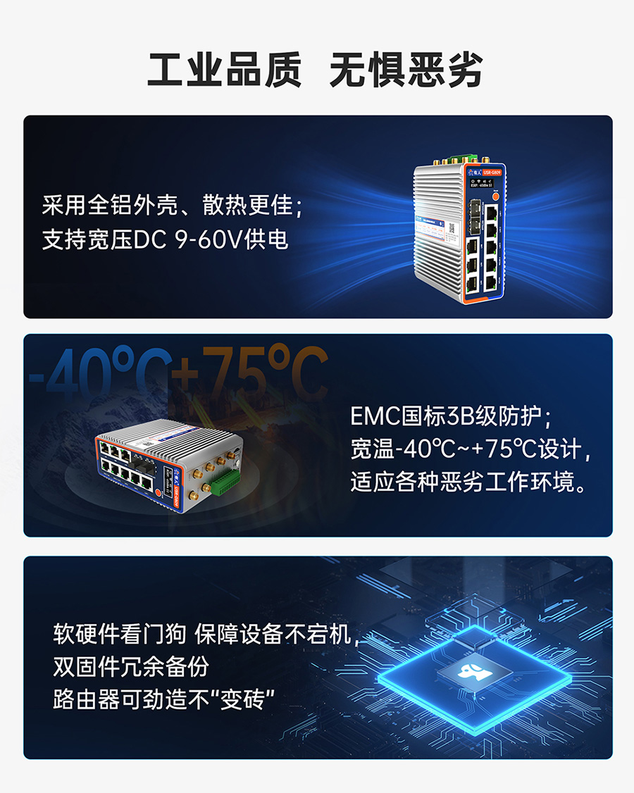 某智能制造企業部署了200臺普通商用路由器連接生產線PLC,因缺乏“三防”設計,每年因雷擊、浪涌、ESD導致的故障率高達15%,運維成本超50萬元。改用滿足IEC 61000-4-5 Level 3、IEC 61000-4-2 15kV標準的工業路由器(如G806w)后,故障率降至2%以下,運維成本降低80%。