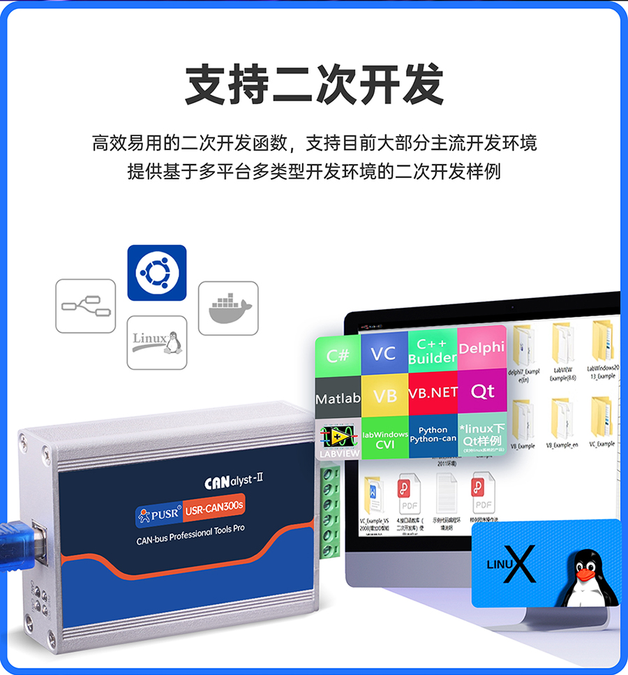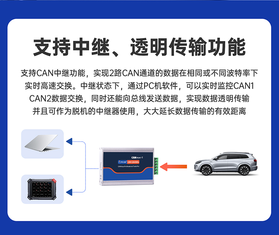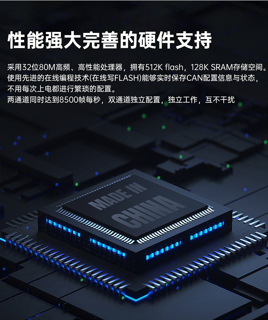 可通過USB采集CAN總線數(shù)據(jù),連接PC,實現(xiàn)CAN數(shù)據(jù)與PC端雙向傳輸;支持雙路CAN口;搭配專門的分析軟件,實時監(jiān)測、錯誤診斷、波特率配置等功能一應(yīng)俱全,數(shù)據(jù)流轉(zhuǎn)清晰可見。