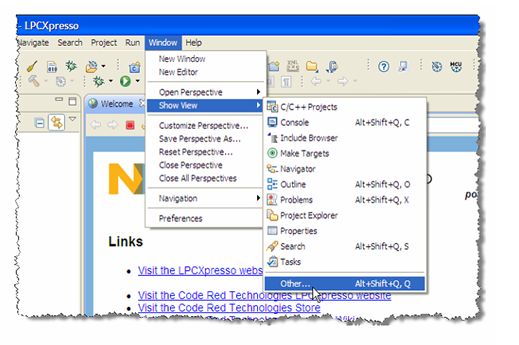 LPCXpresso IDE基于Eclipse IDE框架,在Eclipse文檔中有很多內(nèi)核特征的詳細(xì)描述,在幫助菜單中可以發(fā)現(xiàn)這些幫助文件。更多的用戶文檔可以到Code Red的網(wǎng)站上獲得。4.1 LPCXpresso的桌面布局 LPCXpresso桌面包含很多窗口,每一個(gè)窗口分別顯示LPCXpresso環(huán)境一個(gè)特定的詳細(xì)數(shù)據(jù),因而被稱為觀察窗口,這些數(shù)據(jù)可以是源代碼、hex數(shù)據(jù)、反匯編、存儲(chǔ)器內(nèi)容等等。觀察窗口可以打開(kāi)、移動(dòng)、固定、關(guān)閉,并且當(dāng)前的窗口布局可以保存和恢復(fù)。一個(gè)特殊的窗口配置稱之為“透視圖”。在LPCXpresso中,無(wú)論代碼編寫還是調(diào)試都在一個(gè)界面下進(jìn)行。這種方式使得開(kāi)發(fā)工作變得簡(jiǎn)單和高效。所有的觀察窗口都可以隨意拖動(dòng)。如果一個(gè)觀察窗口被無(wú)意關(guān)閉了,可以從“Show View”對(duì)話框中再次打開(kāi)。“Show View”對(duì)話框可以從“Window”---“Show View”---“other”中打開(kāi),如下圖所示。