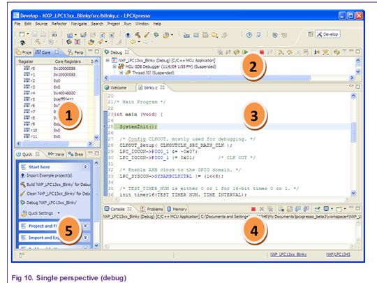 然后就可以從項(xiàng)目列表中選擇例程項(xiàng)目。要確保“Blinky”和“CMSIS”這兩個(gè)項(xiàng)目都存在。單擊“Finish”,這兩個(gè)項(xiàng)目將會(huì)被導(dǎo)入到當(dāng)前工作區(qū)。在快速啟動(dòng)面板里單擊“Build all projects(Debug)”開(kāi)始編譯Blinky例子和CMSIS庫(kù)。5.2 在開(kāi)發(fā)板上調(diào)試/運(yùn)行“blinky”程序 LPCXpresso開(kāi)發(fā)界面下,當(dāng)開(kāi)始調(diào)試的時(shí)候,程序會(huì)自動(dòng)下載到目標(biāo)MCU的flsh中。 在項(xiàng)目管理區(qū)中選中將要調(diào)試的項(xiàng)目,然后點(diǎn)擊快速啟動(dòng)面板中的“Debug project ‘Blinky’”。這時(shí)會(huì)彈出一個(gè)詢問(wèn)你使用哪種執(zhí)行方式(發(fā)布或調(diào)試,Release or Debug)選項(xiàng)的對(duì)話框,選擇“Debug(調(diào)試)”選項(xiàng),然后單擊“OK”完成程序下載和創(chuàng)建項(xiàng)目調(diào)試操作。如下圖所示。