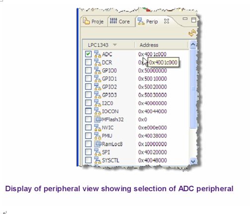 4.1.2.1 外設(shè)觀察窗口 LPCXpresso IDE有一個(gè)包含所有外設(shè)的注釋、交互式調(diào)試觀察窗口。可以通過(guò)標(biāo)簽項(xiàng)選擇寄存器觀察窗口或者外設(shè)觀察窗口。外設(shè)被選中后,會(huì)在控制臺(tái)觀察窗口顯示“memory”觀察窗口。分別如下圖所示。