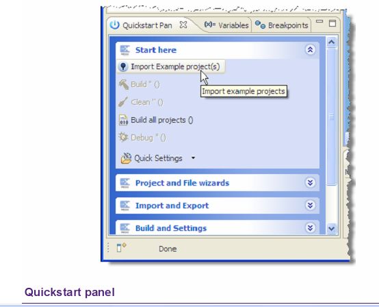 l 在快速啟動(dòng)面板中,單擊“Start Here”,然后選擇”Import Example project(s)“。如下圖所示。l 在彈出的頁(yè)面中,從“Browse”中選擇例程所在的目錄。根據(jù)提示打開(kāi)例程即可。如下圖。