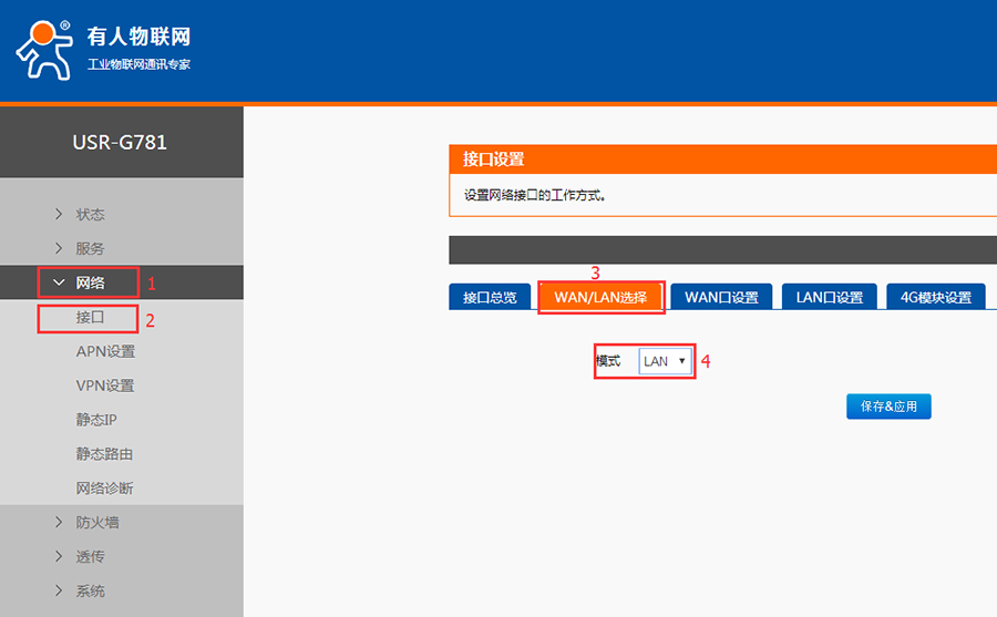 這種方式進行組網(wǎng)網(wǎng)時只需要進行一步設(shè)置即可達(dá)到該組網(wǎng)的要求,只需要在內(nèi)置網(wǎng)頁中將網(wǎng)口的WAN口工作模式改成LAN口,具體頁面請參照上圖。