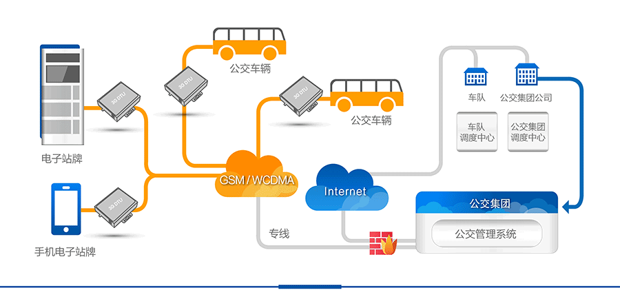 公交集團采購大量3G DTU應用到公交汽車中,將公交汽車的各類信息(包括位置信息、IC卡數據等) 實時發送到各類平臺上,方便用戶乘車,實現智慧城市。