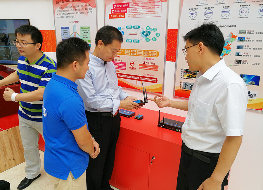 王總身臨一線,親自為各位參觀領導仔細講解產品用途和技術背景。中航工業的領導拿起一款4G工業路由器USR-G806表現出濃厚興趣,王總介紹道:“這款工業路由器是利用運營商的3G/4G網絡,實現工業設備戶外高速穩定的網絡部署,在ATM機、自動快遞柜、自動售貨機、廣告屏等領域有著非常廣泛的應用。
